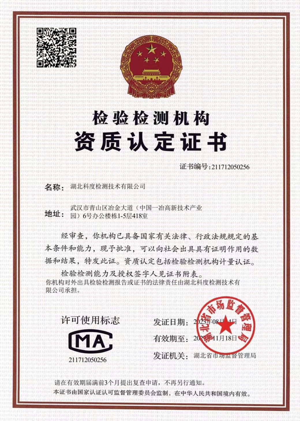 湖北科度檢測(cè)技術(shù)有限公司是一家專業(yè)從事環(huán)境類及相關(guān)領(lǐng)域檢測(cè)的第三方檢測(cè)機(jī)構(gòu),公司已通過湖北省市場(chǎng)監(jiān)督管理局CMA計(jì)量認(rèn)證,可以面向社會(huì)出具權(quán)威CMA檢測(cè)報(bào)告。 我公司實(shí)驗(yàn)室嚴(yán)格按照國家標(biāo)準(zhǔn)建設(shè),擁有一大批國內(nèi)外先進(jìn)儀器設(shè)備及現(xiàn)代化配套設(shè)施,并有經(jīng)驗(yàn)豐富的中高級(jí)專業(yè)技術(shù)人員和嚴(yán)格的實(shí)驗(yàn)室質(zhì)量保證體系為項(xiàng)目運(yùn)作提供強(qiáng)力支撐。 作為第三方檢測(cè)機(jī)構(gòu),公司始終以高度的社會(huì)責(zé)任感經(jīng)營企業(yè),以“公正、嚴(yán)謹(jǐn)、高效”為宗旨,依托專業(yè)的技術(shù)實(shí)力為客戶提供專業(yè)優(yōu)質(zhì)檢測(cè)服務(wù),受到政府、企業(yè)和社會(huì)各界的廣泛關(guān)注和認(rèn)可。